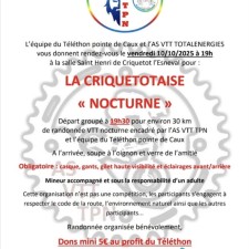 L'équipe du Téléthon pointe de Caux et l'AS VTT TOTALENERGIES vous donnent rendez-vous le vendredi 10 octobre 2025 à 19h à la salle Saint Henri de Criquetot-l'Esneval pour la Criquetotaise "nocturne".